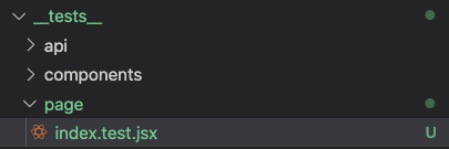 컴포넌트 테스트를 위해 먼저 테스트 폴더들을 생성해 줍니다. root에 __test__ 폴더를 만들고 하위 폴더들을 생성해 줍니다. 마지막으로 page의 index를 테스트하기 위한 index.test.jsx를 생성합니다.