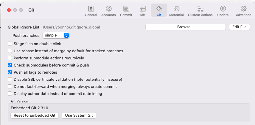 설정 -> git 탭에서 git version을 변경해 주었더니 해결되었습니다. 기존에는 스크린샷과 같이 embedded git 2.31.0으로 되어있었는데요, use system git 버튼을 눌러 2.32.1로 변경해 주었더니 해결되었습니다.